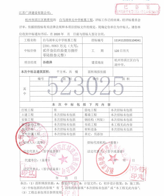 白馬湖單元中學(xué)樁基單位中標通知書