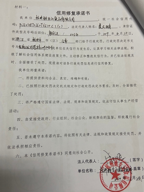 信用修復(fù)——杭州姚生記食品有限公司