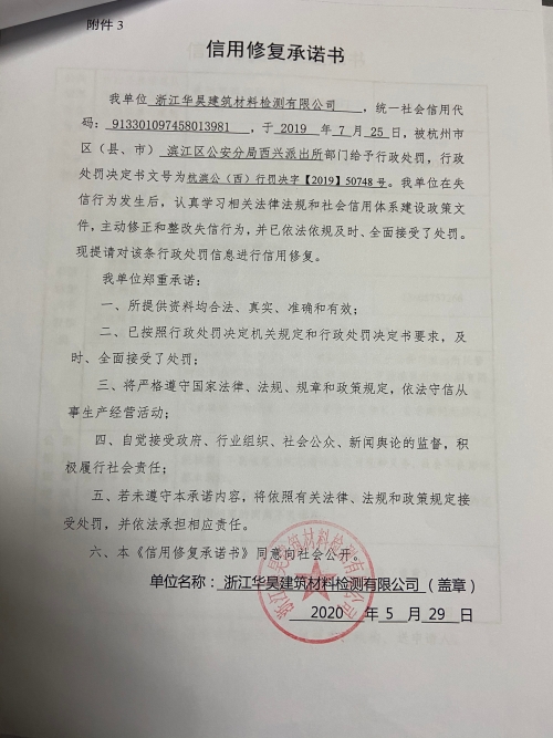 信用修復(fù)——浙江華昊建筑材料檢測有限公司