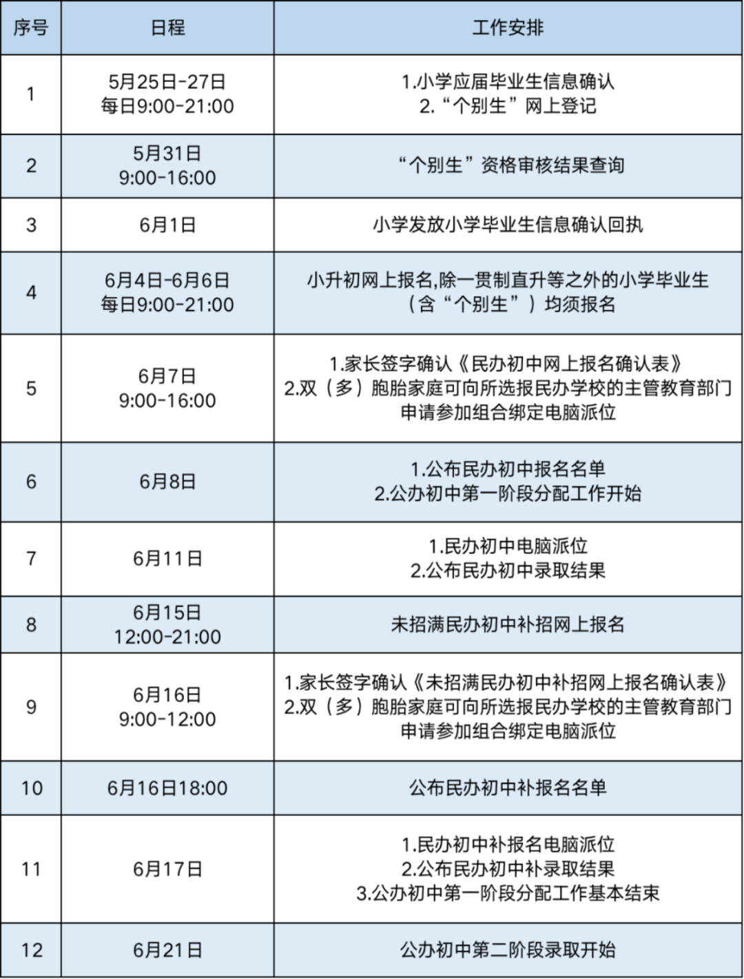 6月8日-17日公辦初中第一階段錄取,7月12日-22日公辦小學第一階段錄取。錄取時,在選報公辦學校的兒童少年中,按照“住、戶一致”優(yōu)先原則和“同表次按學生落戶時間先后”原則排序。其中,公辦小學錄取兒童戶籍、父母戶籍、家庭住房三者一致且均在學校學區(qū)內(nèi)的兒童,以及本學區(qū)內(nèi)世居家庭兒童(公辦初中同);公辦初中錄取對口小學畢業(yè)且學生戶籍、父母戶籍、家庭住房三者一致,且均在對口小學學區(qū)內(nèi)的學生。