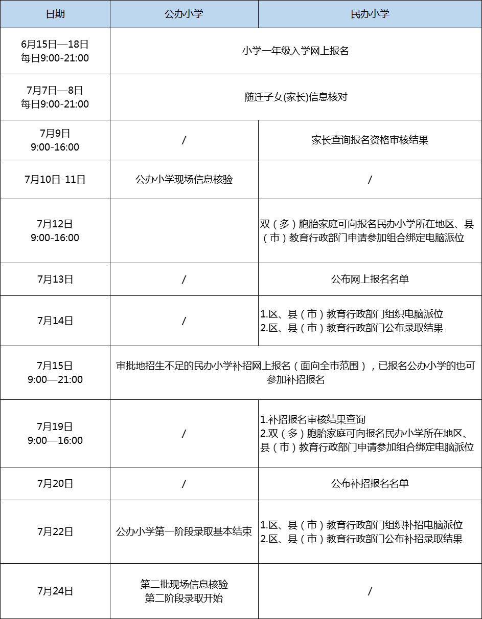 6月8日-17日公辦初中第一階段錄取,7月12日-22日公辦小學第一階段錄取。錄取時,在選報公辦學校的兒童少年中,按照“住、戶一致”優先原則和“同表次按學生落戶時間先后”原則排序。其中,公辦小學錄取兒童戶籍、父母戶籍、家庭住房三者一致且均在學校學區內的兒童,以及本學區內世居家庭兒童(公辦初中同);公辦初中錄取對口小學畢業且學生戶籍、父母戶籍、家庭住房三者一致,且均在對口小學學區內的學生。