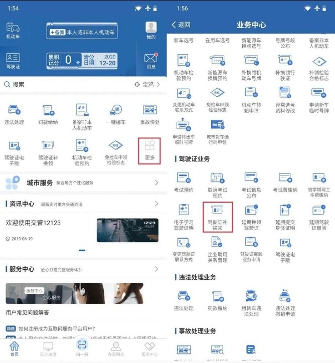 登錄"交管12123"APP后,通過(guò)【業(yè)務(wù)中心】→【駕駛證補(bǔ)換領(lǐng)】,進(jìn)入駕駛證補(bǔ)換領(lǐng)業(yè)務(wù)流程。