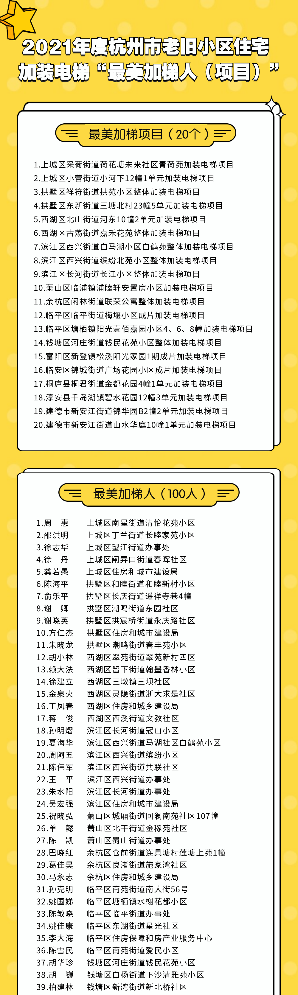 老舊小區加裝電梯工作是近年來的社會熱點、民生重點。截至2022年4月底,全市累計完工加梯項目3562臺,惠及近4.3萬住戶。為積極發掘“最美加梯”故事,大力弘揚“最美加梯”精神,通過民主推薦、層層選拔、審核公示,今天,市既有住宅加裝電梯工作領導小組辦公室公布了2021年度“最美加梯人(項目)”名單,周惠等100名“最美加梯人”和“上城區采荷街道荷花塘未來社區青荷苑加裝電梯項目”等20個“最美加梯項目”入選。