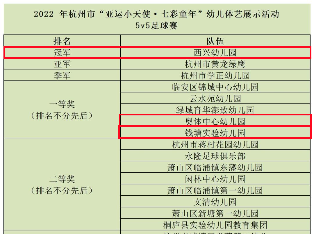 近日,在杭州市教育局、杭州市體育局等單位舉辦的“七彩童年”體藝展示活動中,濱江區選派的三支幼兒園球隊成績突出,其中,濱江區西興幼兒園足球隊喜獲杭州市冠軍!濱江區錢塘實驗幼兒園、濱江區奧體中心幼兒園晉級八強,在本次比賽中獲得一等獎!