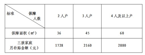 三孩家庭未達到低收入家庭標準比照低收入保障家庭補貼標準為48元/平方米·月,申請戶可獲得的貨幣補貼金額如下: