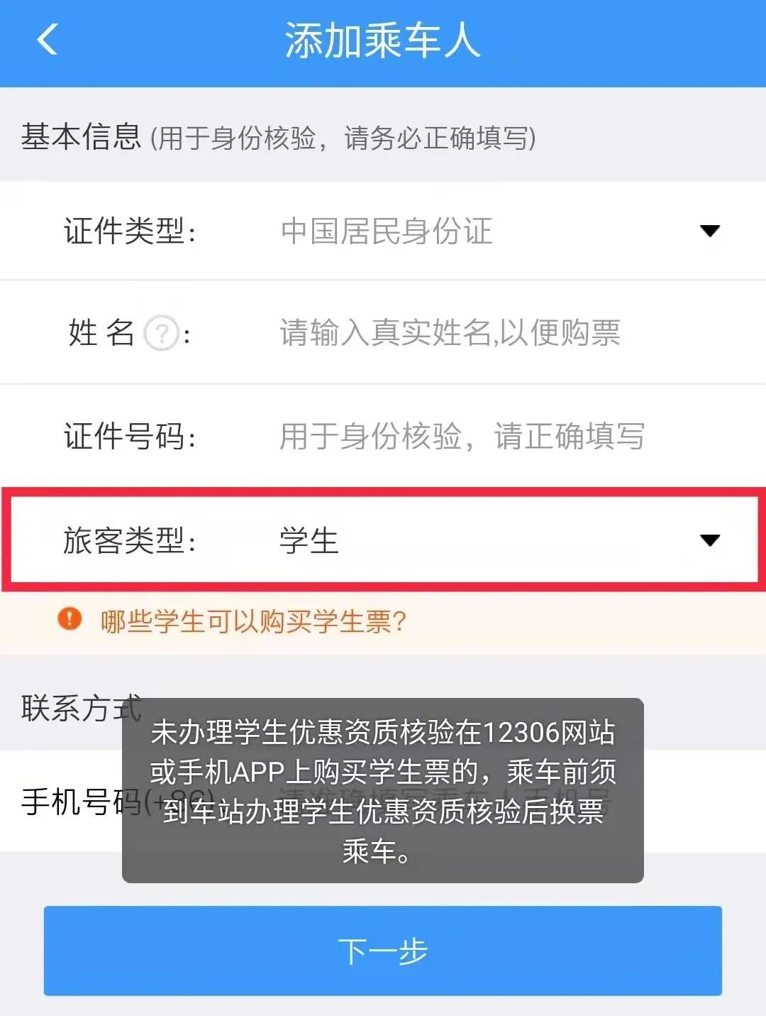 在添加乘車人時將旅客類型選為“學生”