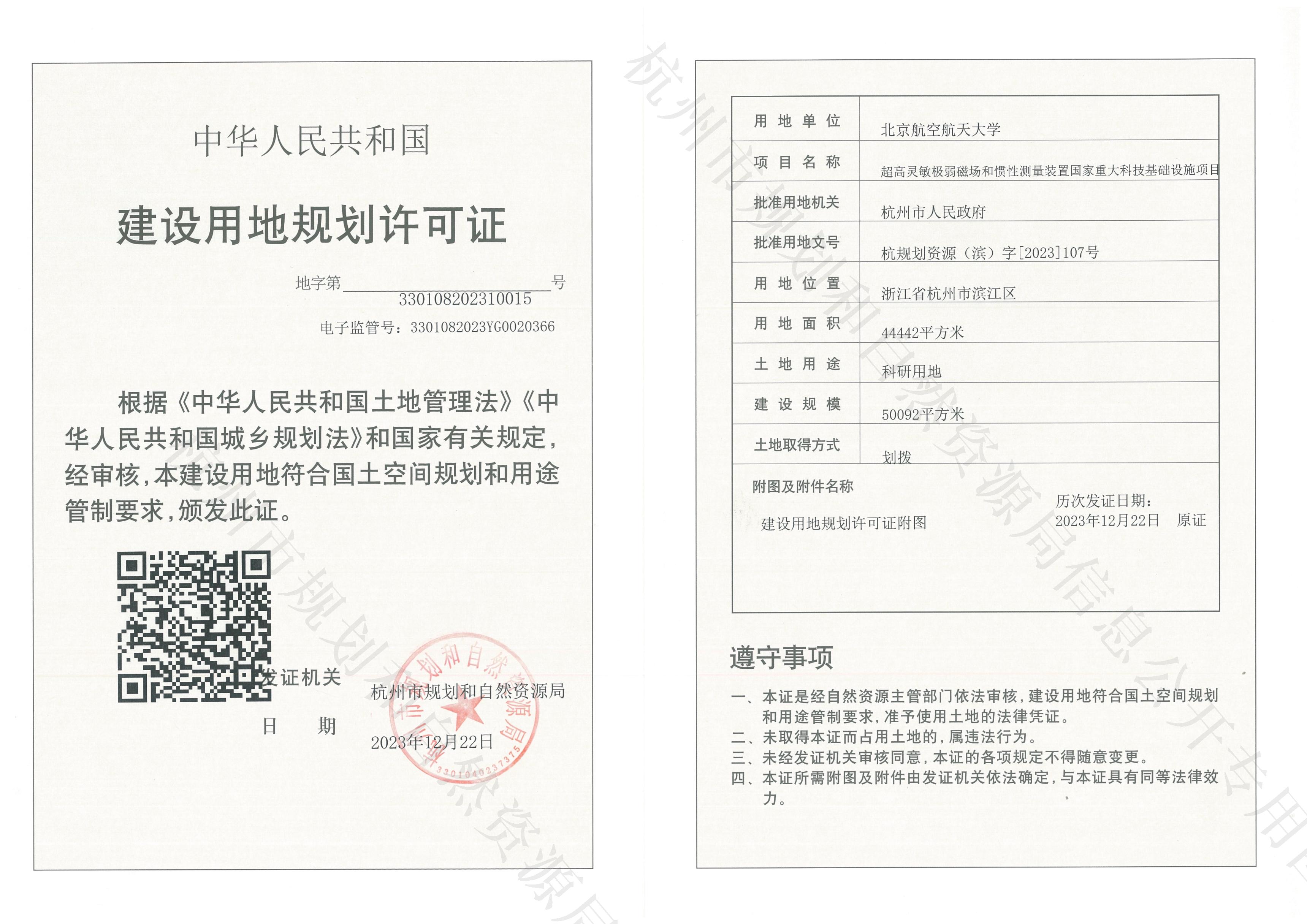 建設用地規劃許可 超高靈敏極弱磁場和慣性測量裝置國家重大科技基礎設施項目
