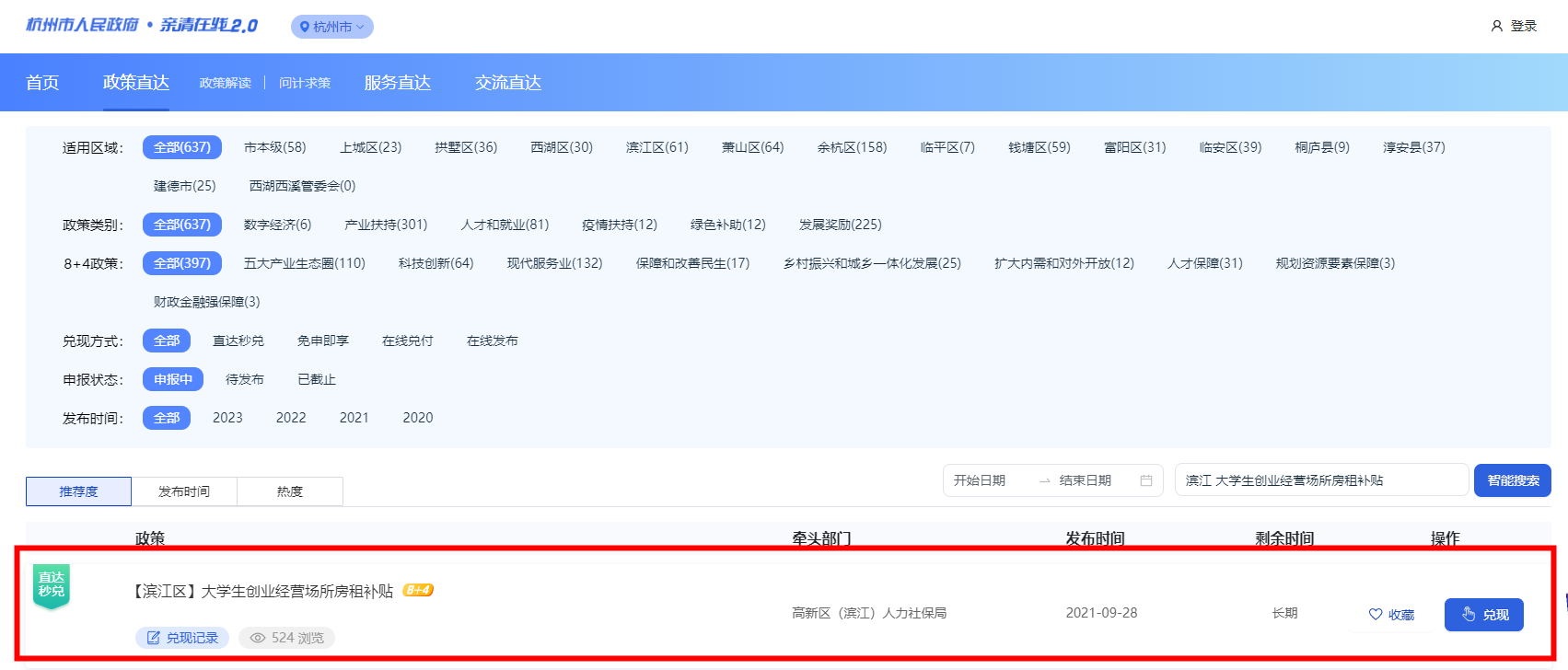 親清在線https://qinqing.hangzhou.gov.cn,高新區(qū)(濱江)大學生創(chuàng)業(yè)經(jīng)營場所房租補貼申請。