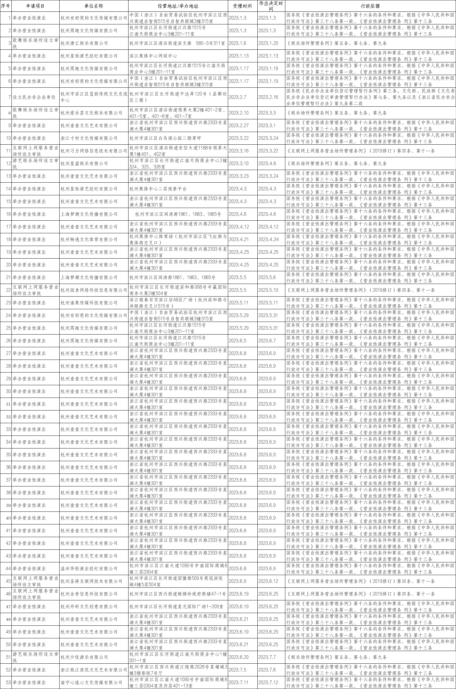 濱江區(qū)文廣旅體局2023年1-6月關(guān)于公共文化服務(wù)領(lǐng)域行政許可信息匯總