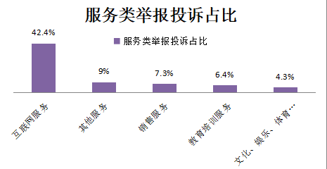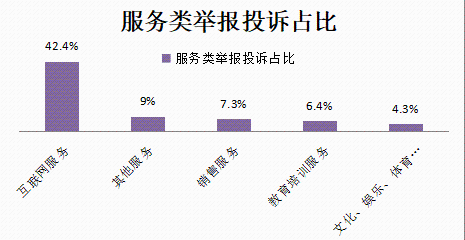 服務類舉報投訴44601件,其中互聯網服務18909件、其他服務4012件、銷售服務3236件、教育培訓服務2867件、文化、娛樂、體育服務1910件。合計占比69.4%。