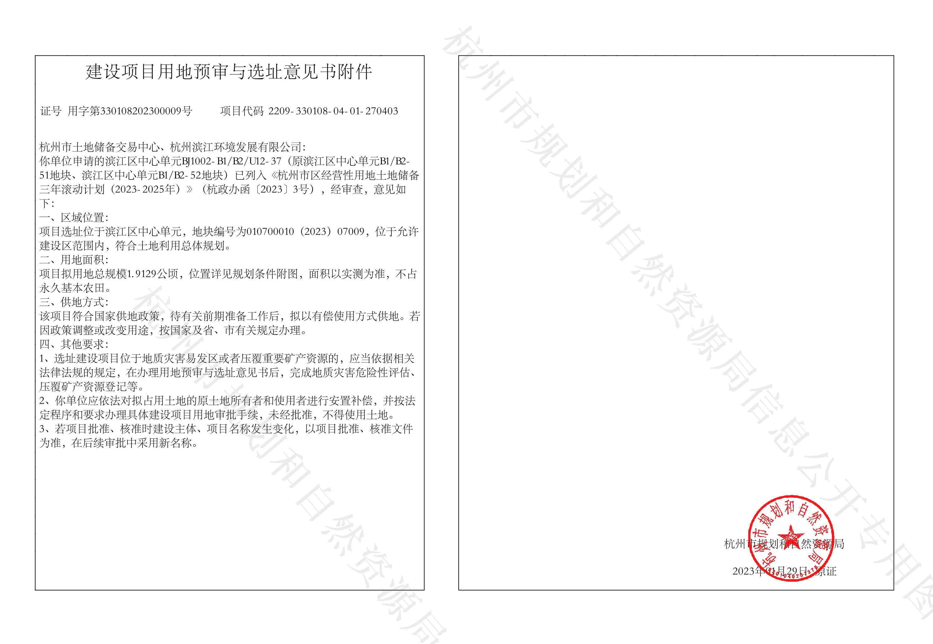 建設項目選址意見書和用地預審-濱江區中心單元BJ1002-B1/B2/U12-37(原濱江區中心單元B1/B2-51地塊、濱江區中心單元B1/B2-52地塊)