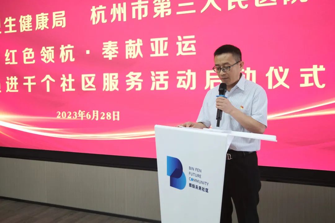 6月28日上午,濱江區衛生健康局與杭州市第三人民醫院共同組織的“紅色領杭·奉獻亞運”萬名黨員進千個社區服務活動(濱江分會場)啟動儀式在西興街道繽紛未來社區舉行。區衛健局黨委書記、局長楊曉紅,市三醫院黨委書記張祖勇,西興街道辦事處副主任楊偉慶和城市醫聯體及屬地街道相關負責人參加。區衛健局黨委委員、副局長卜征主持儀式。