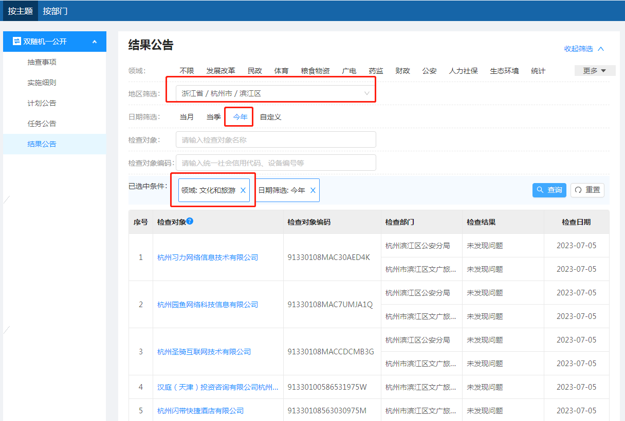 2023年1-6月涉及文化和旅游領域的“雙隨機、一公開”結果共有1057條。具體內容可在浙江政務服務網中的“雙隨機、一公開”專欄進行查詢。
