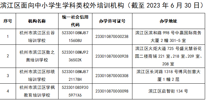 濱江區教育局再次鄭重提醒:有培訓需求的中小學生及家長,要選擇證照齊全的機構進行培訓,保障自身合法權益。自覺遠離“無證無照”培訓機構,不參加以托管、家教、咨詢及“家政服務”“住家教師”“眾籌私教”等名義開展的各種隱形變異學科類培訓,不參加非學科類培訓機構組織的學科類培訓。如發現“白名單”中的校外培訓機構有安全隱患或違反“雙減”政策辦學行為可及時舉報,一經查實,將對相關培訓機構依法進行嚴肅處理。(監督熱線:0571-87702003)
