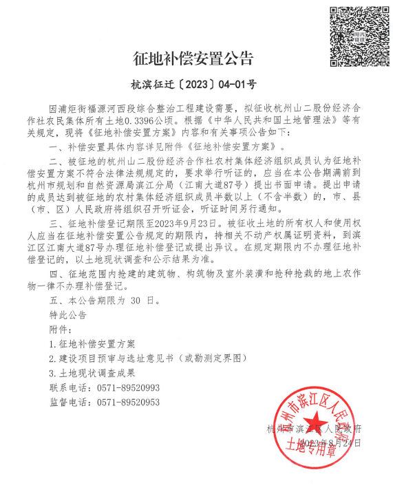 征地補償安置公告(杭濱征遷[2023]04號)