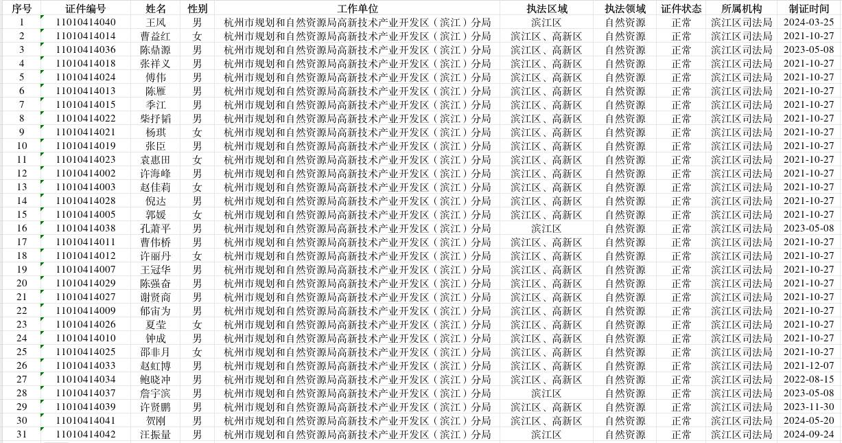 杭州市規劃和自然資源局濱江分局執法人員統計表