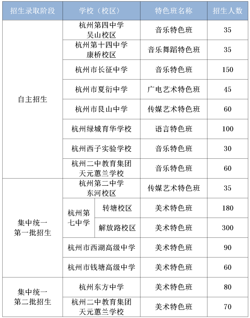 集中統一第一、二批招生錄取特色班術科測試由各招生學校負責組織實施。其中,招收美術特色班的杭州第七中學兩個校區、杭州市西湖高級中學、杭州市錢塘高級中學、杭州東方中學、杭州二中教育集團天元蕙蘭學校將聯合進行美術類術科測試。
