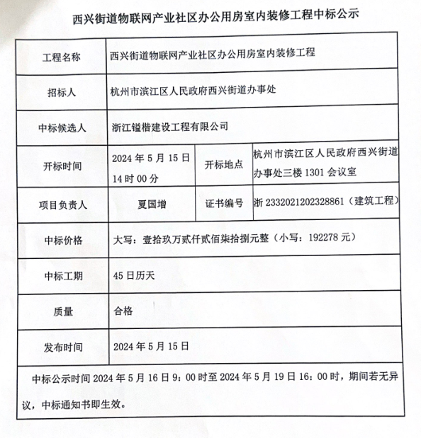 西興街道物聯網產業社區辦公用房室內裝修工程中標公示