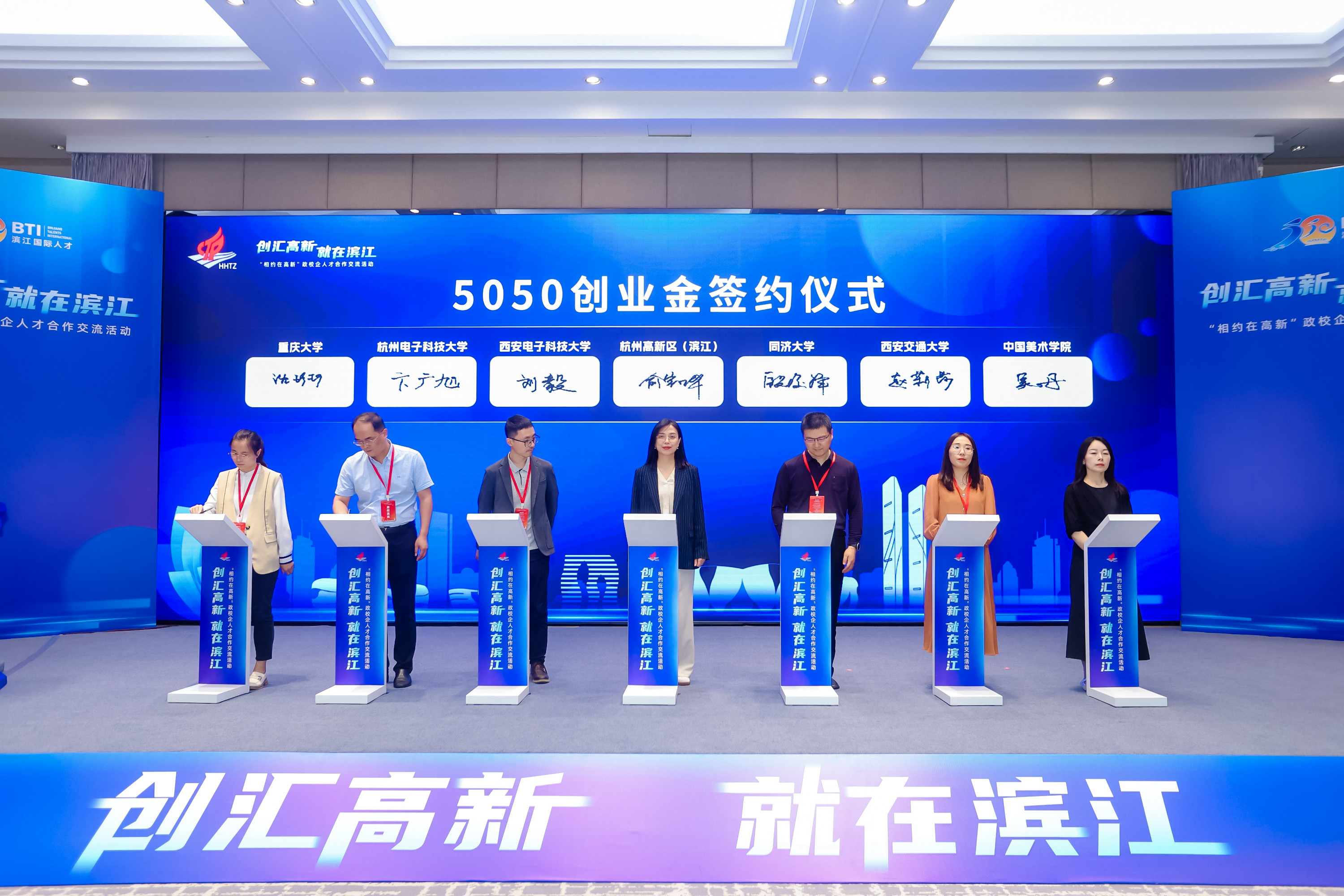 區人力社保局與重慶大學、杭州電子科技大學、西安電子科技大學、同濟大學、西安交通大學、中國美術學院等6所高校簽訂“5050創業金”協議。
