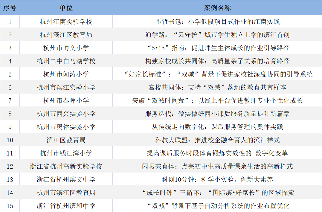 三年來,濱江區以優化濱江教育生態、創設更佳育人環境為核心,聚焦學生作業負擔和課外培訓負擔,積極打好“雙減”背景下的減負組合拳。我區學校和研究院深入提煉“雙減”特色經驗做法,共有15項案例入選浙江省“雙減”優秀實踐案例。