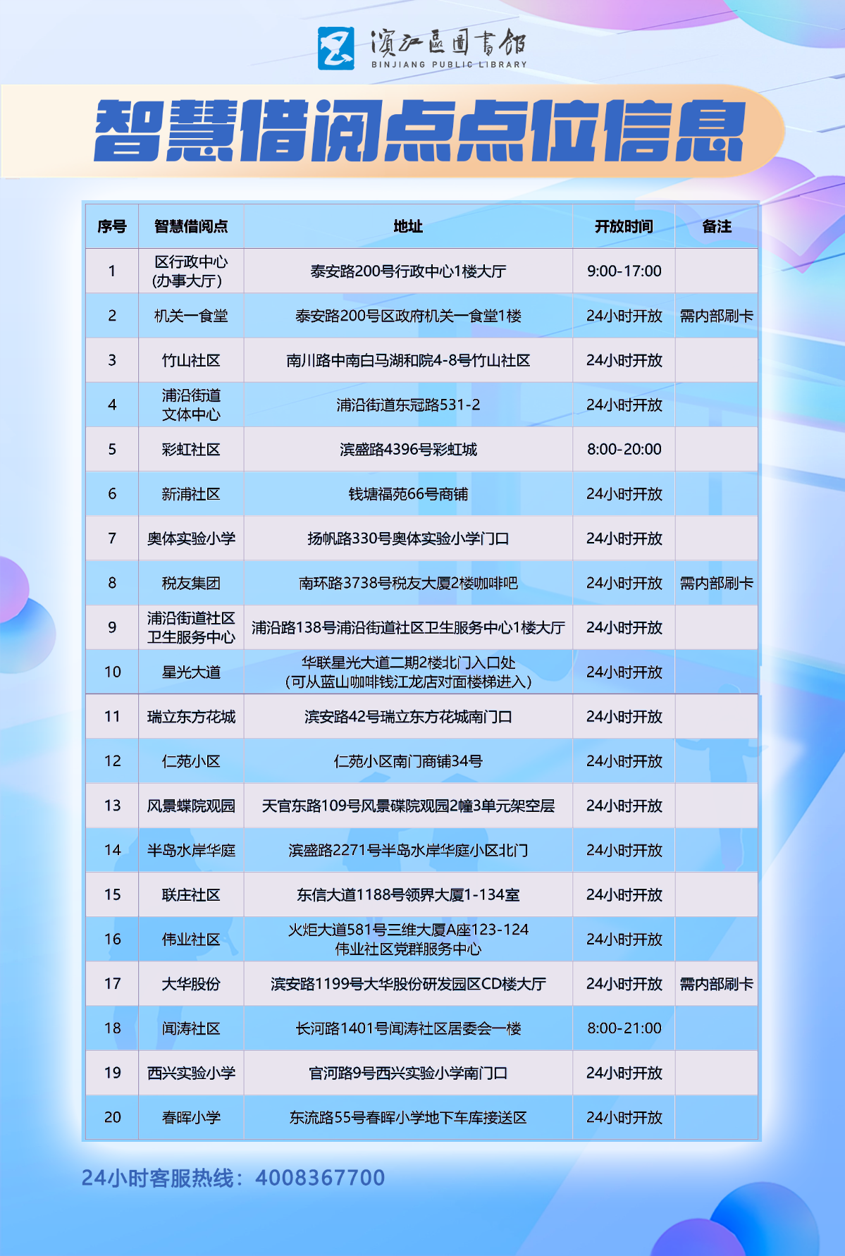 濱江區(qū)圖書(shū)館各分館、城市書(shū)房及智慧借閱點(diǎn)一覽表