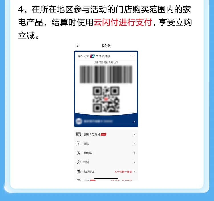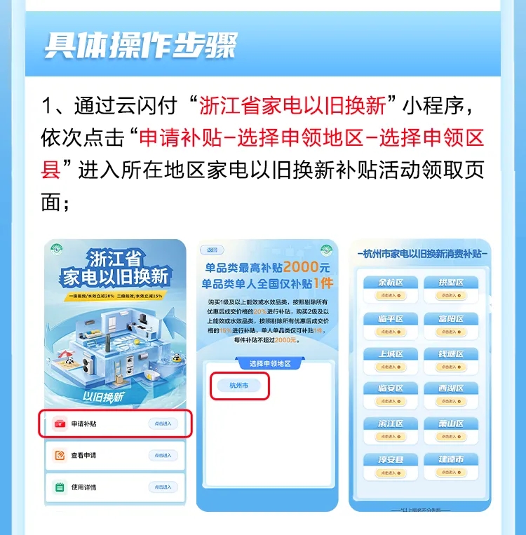 好消息,濱江區金秋線下家電以舊換新全面啟動!對個人消費者直接新購8類家電產品給予15%或者20%補貼,最高補貼16000元,線上平臺及實體門店均可參與! 活動時間2024年9月12日上午10:00—2024年12月31日 (活動采用預算制,活動期間補貼名額先到先得) 補貼標準對個人消費者購買冰箱、洗衣機、電視、空調、電腦、熱水器、家用灶具、吸油煙機8類產品進行以舊換新補貼: 1級能效產品按照銷售價格20%予以補貼;2級能效產品按照銷售價格的15%予以補貼;每位消費者每一類產品可補貼1件,每件補貼不超過2000元;參與活動一人最高可享受家電補貼共16000元。 參與形式此次家電以舊換新活動,消費者通過銀聯云閃付、支付寶APP(近期開通)在參與活動的實體門店購買。 申領流程通過銀聯云閃付、支付寶等APP搜索“杭州以舊換新”“浙江省家電以舊換新”等關鍵字進入活動頁面,點擊進入“領取補貼資格”頁面,根據需求選擇相應品類領取補貼資格券,消費者在付款時,按照剔除該店鋪的所有優惠后成交價格的基礎上再享受政府15%或者20%的“立購立減”購置補貼。 為了確保符合“每個消費者每一類商品只可購買一件”的活動規則,通過銀聯云閃付、支付寶等任一渠道領券后,僅支持通過該渠道購買商品,不可重復領券。在某一平臺上領取券后,如果想選擇其他渠道,可選擇解綁資格。 銀聯云閃付APP家電補貼申領流程 打開云閃付APP,搜索“浙江家電以舊換新”或者點擊首頁上的“家電補貼”。 1、點擊“申請補貼”,選擇“杭州市”—“濱江區”進入家電以舊換新補貼活動領取頁面。 2、選擇需要申領補貼的家電品類,點擊“領取”,授權并填寫個人信息后,系統核驗通過,即可領取15%和20%立減補貼。 3、在參與活動的門店購買范圍內的家電產品,在結算時使用云閃付進行支付,享受立購立減。 備注:個人消費者領取同一品類的兩張券后僅能核銷一張,券有效期1天,領取后請盡快核銷。 | |||