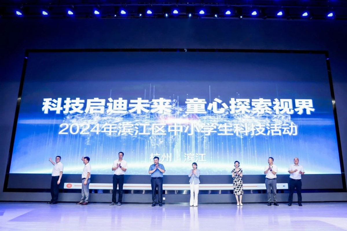 隨后,嘉賓上臺共同啟動賽事倒計時牌。杭州市教育局德育與體育衛(wèi)生藝術處副處長梁樹波宣布2024年濱江區(qū)科技活動各項賽事正式開始。