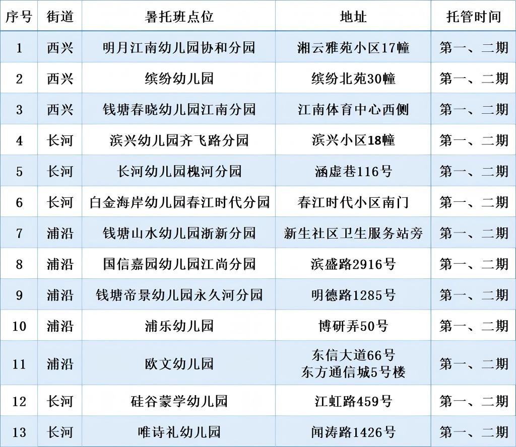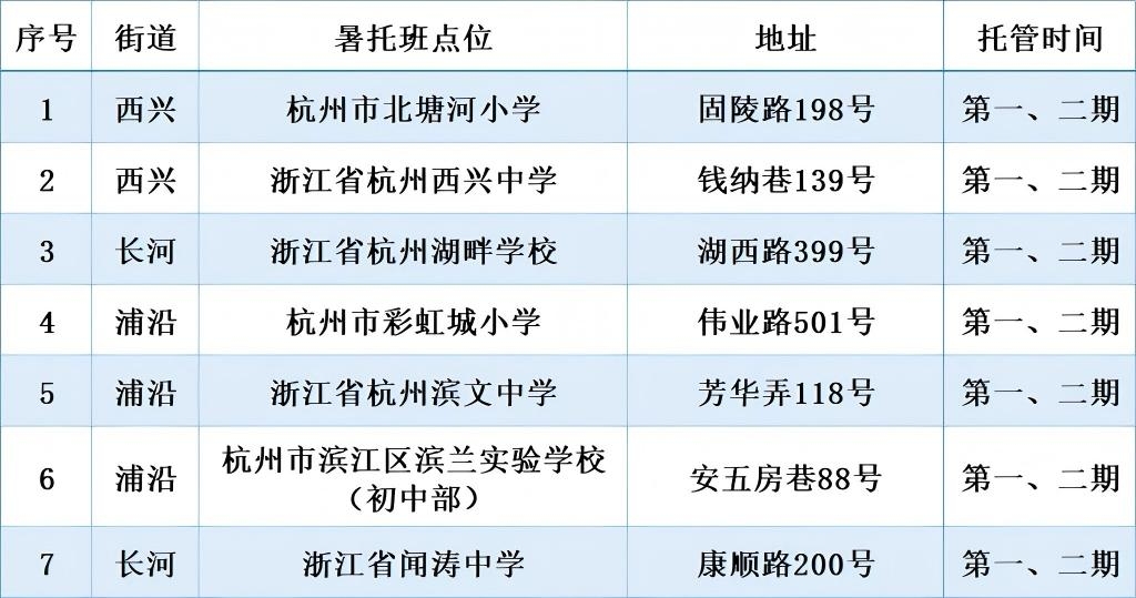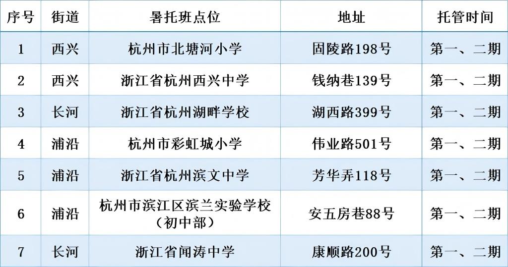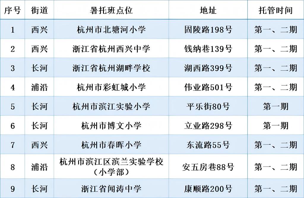 中小學:共2期,每期2周(不含雙休日) 第一期:7月14日—7月25日 第二期:7月28日—8月8日 幼兒園:共2期,每期3周(不含雙休日) 第一期:7月7日—7月25日 第二期:7月28日—8月15日 三、服務地點 2025年濱江區暑期托管班服務點位共29個,分別為: (1)中學7個: (2)小學9個: (3)幼兒園13個: 四、服務內容 中小學服務點均提供作業輔導、閱讀指導、文體活動、綜合實踐、興趣拓展等服務,不補課不上新課。 幼兒園服務點提供游戲活動。 五、服務收費 堅持“公益、自愿”原則,適當收取費用,中小學收費標準700元/人/期(含餐費)或500元/人/期(不含餐費),公辦幼兒園收費標準1050元/人/期(含餐費),困難家庭可適當減免。托管期間午餐采用學校食堂制作或學生營養午餐配送方式。 民辦幼兒園收費標準詳詢對應幼兒園。 六、班額師資 為保障托管服務順利開展,原則上每班招生不超過40人(幼兒園不超過35人),最終以實際報名數編班;報名時間截止時,中小學如某個暑托點報名人數較少,幼兒園班級數不足3個班的,由區教育局協調相鄰點位共同組班。 七、報名錄取方式 1.中小學 (1)6月29日9:00-7月2日19:00,家長可根據下方“濱樂通”登錄和報名操作,在線填寫報名表單并提交,逾期不再接收; (2)7月8日報名學校公布托管學生名單(需關注報名學校公眾號),并根據公眾號推送要求到學校繳費,簽訂暑托協議,領取學員證及了解相關注意事項。 2.幼兒園 直接向班級教師報名,后續事項由班級教師通知。