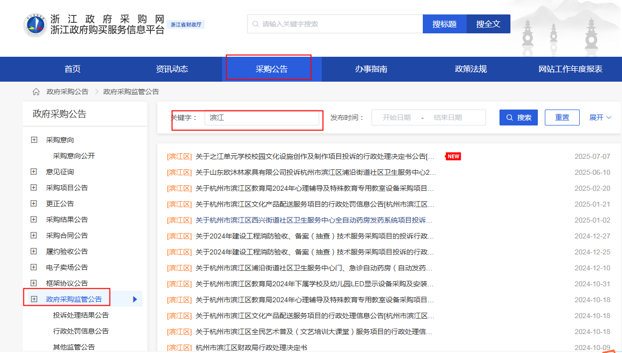 登入浙江政府采購網(wǎng),選擇采購公告--政府采購監(jiān)管公告,再關(guān)鍵詞一欄輸入“濱江區(qū)”或者“濱江”,點(diǎn)擊搜索,進(jìn)行信息查詢。