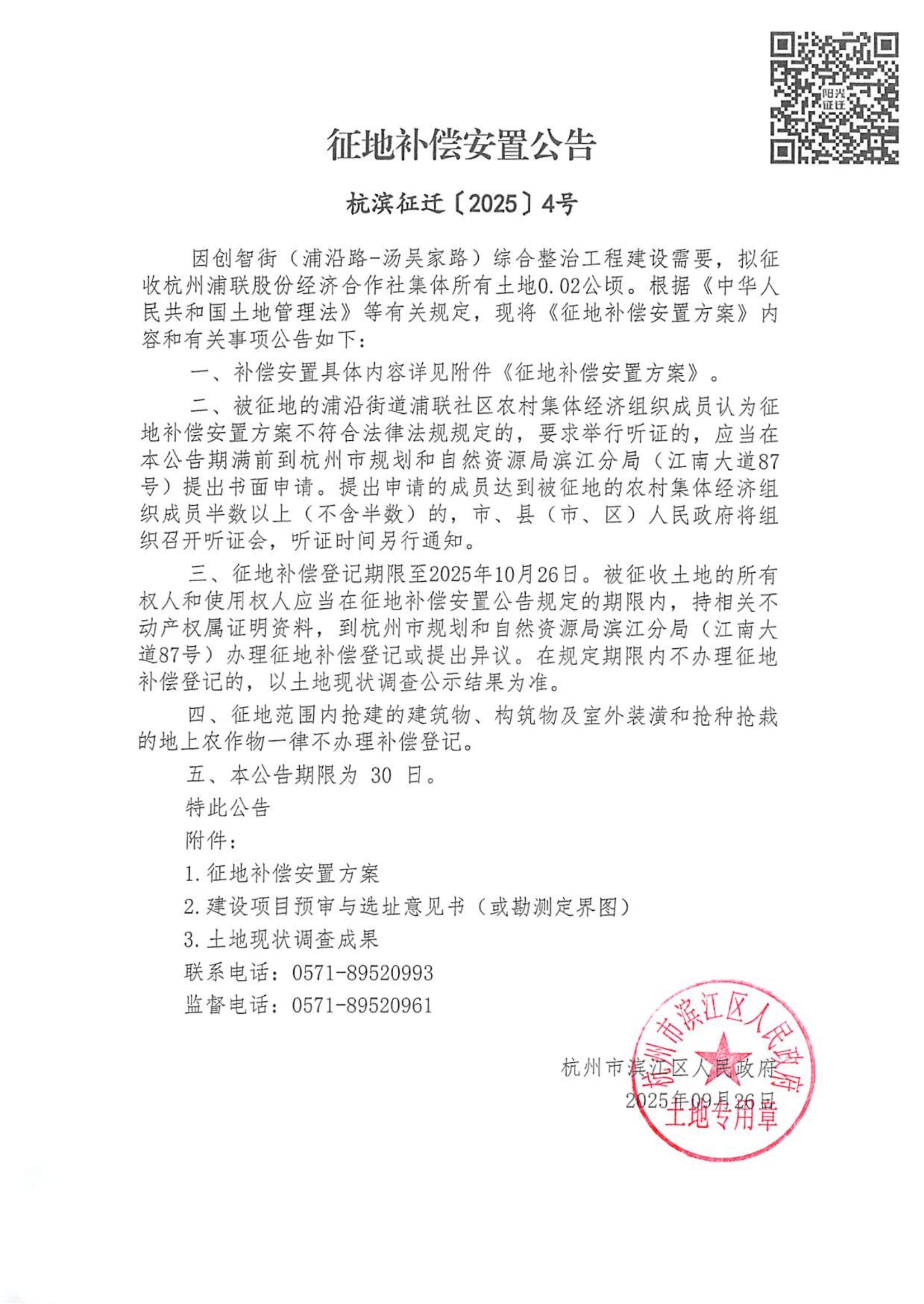 征地補(bǔ)償安置公告(杭濱征遷[2025]4號(hào))