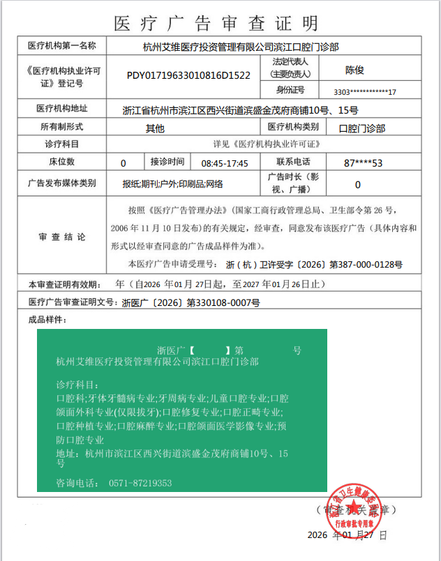 醫療廣告公示——杭州艾維醫療投資管理有限公司濱江口腔門診部